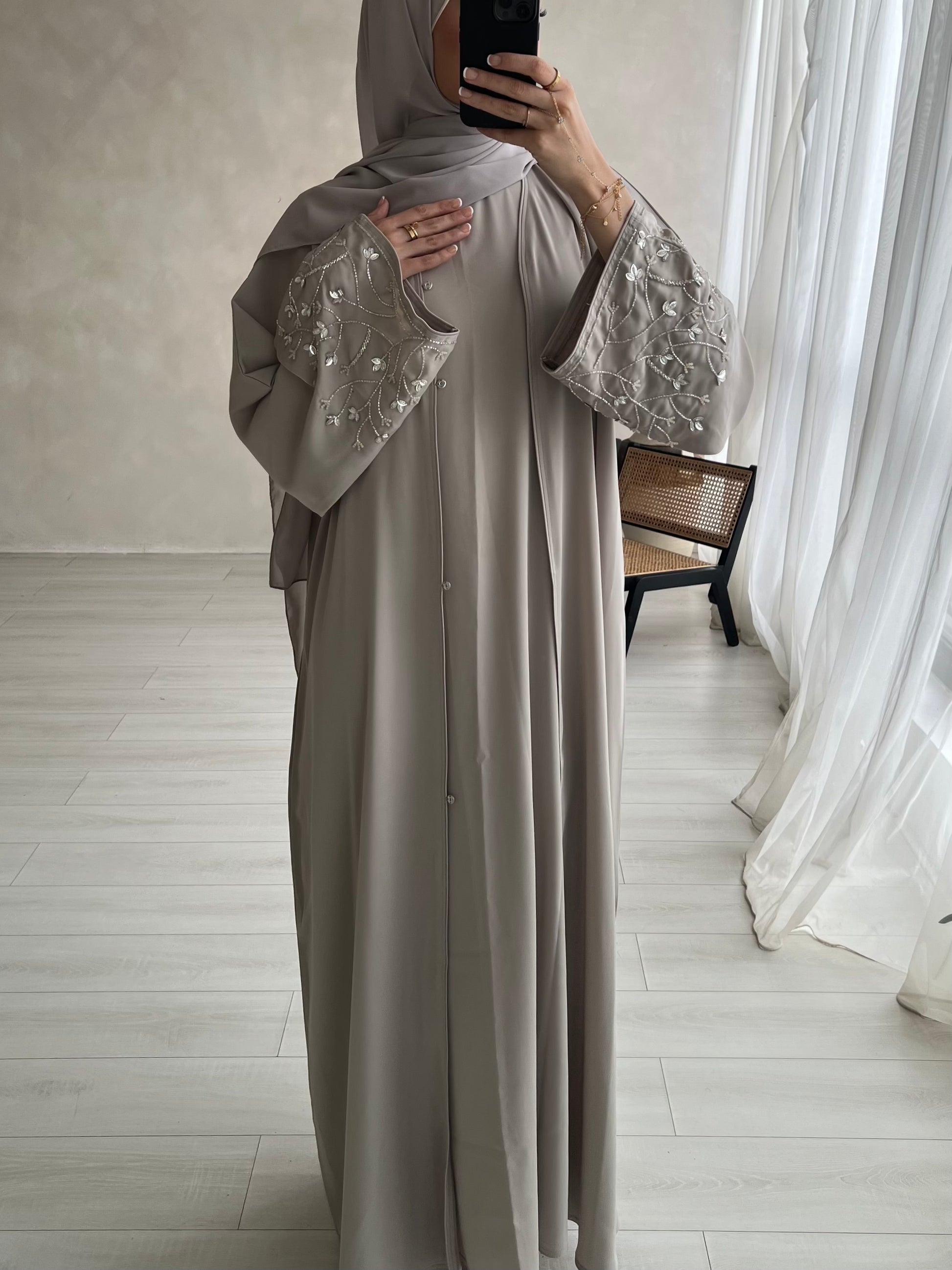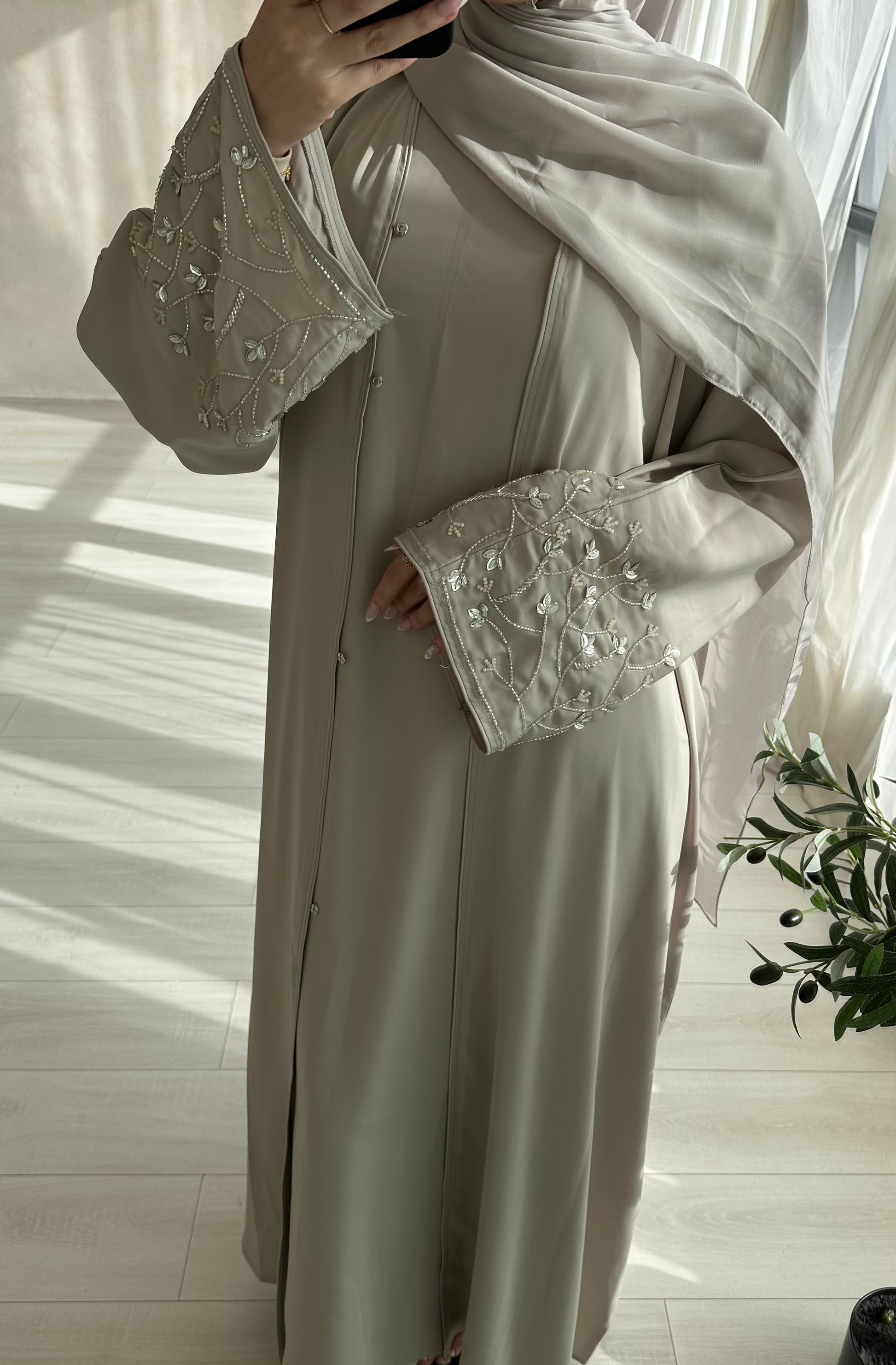 A simple and elegant open abaya made from a comfortable Sula fabric. Each piece includes intricate flower bead detailing on the sleeves. Includes a matching half sleeve inner slip and chiffon hijab!