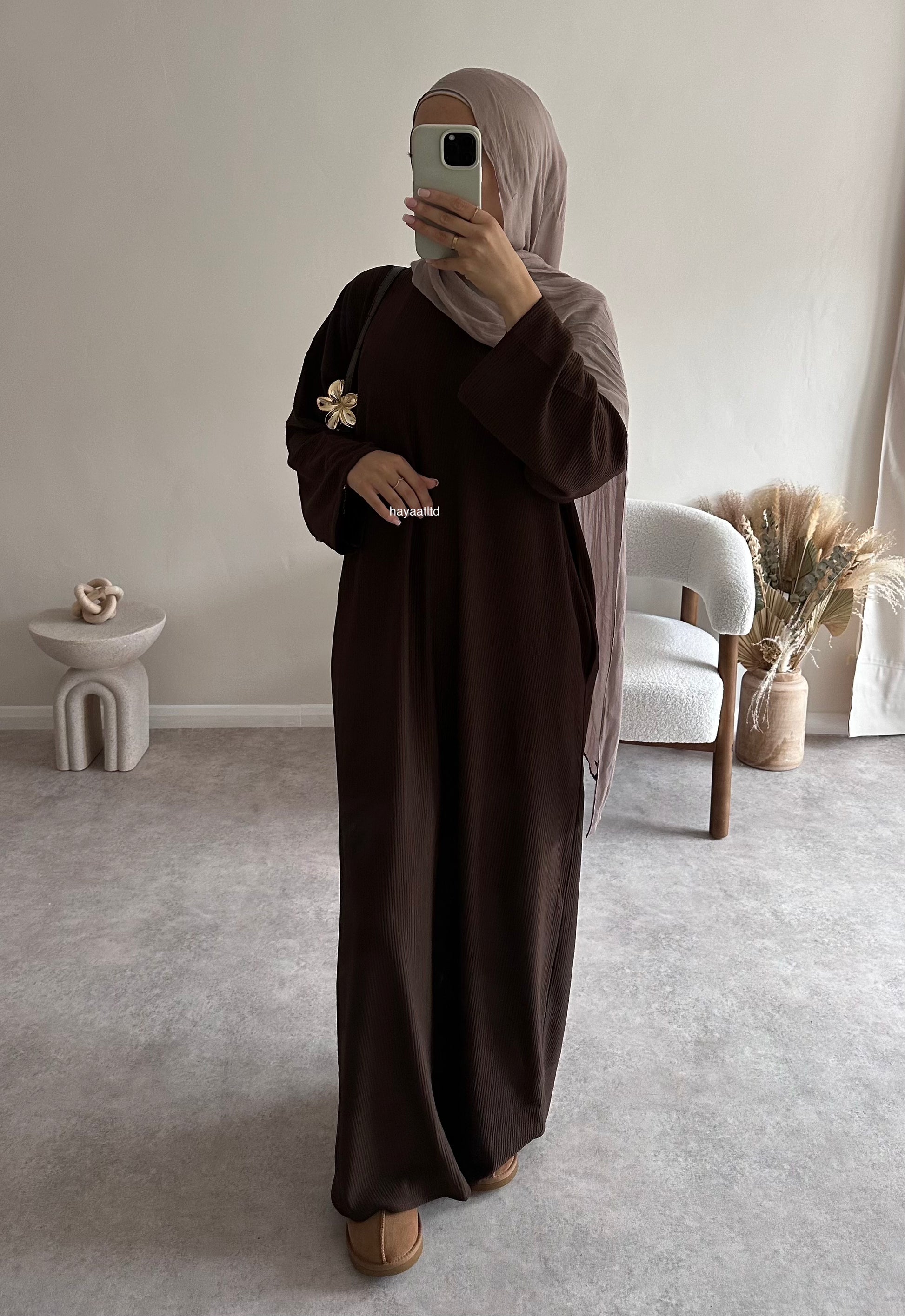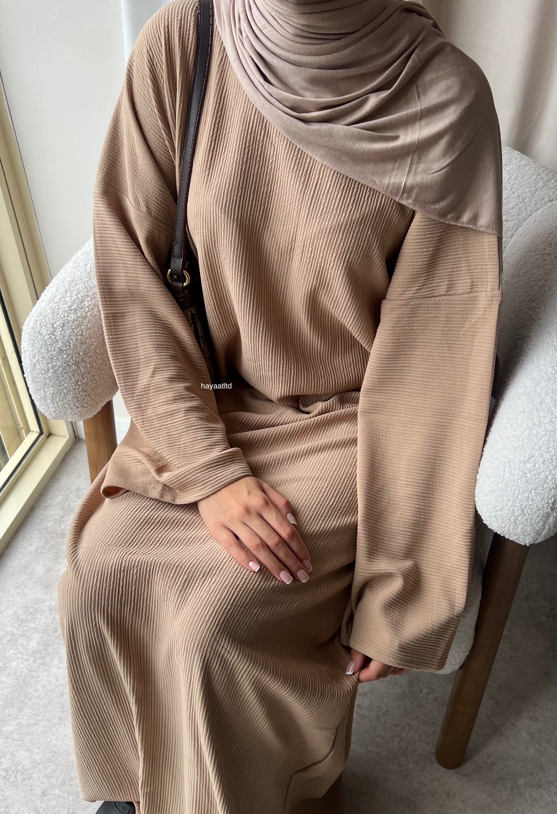 Perfect for everyday wear, our Closed Ribbed Abayas are made from a soft stretchy ribbed fabric and include a matching chiffon hijab. The fitting is a nice slim but loose fit and the abaya includes 2 pockets.
