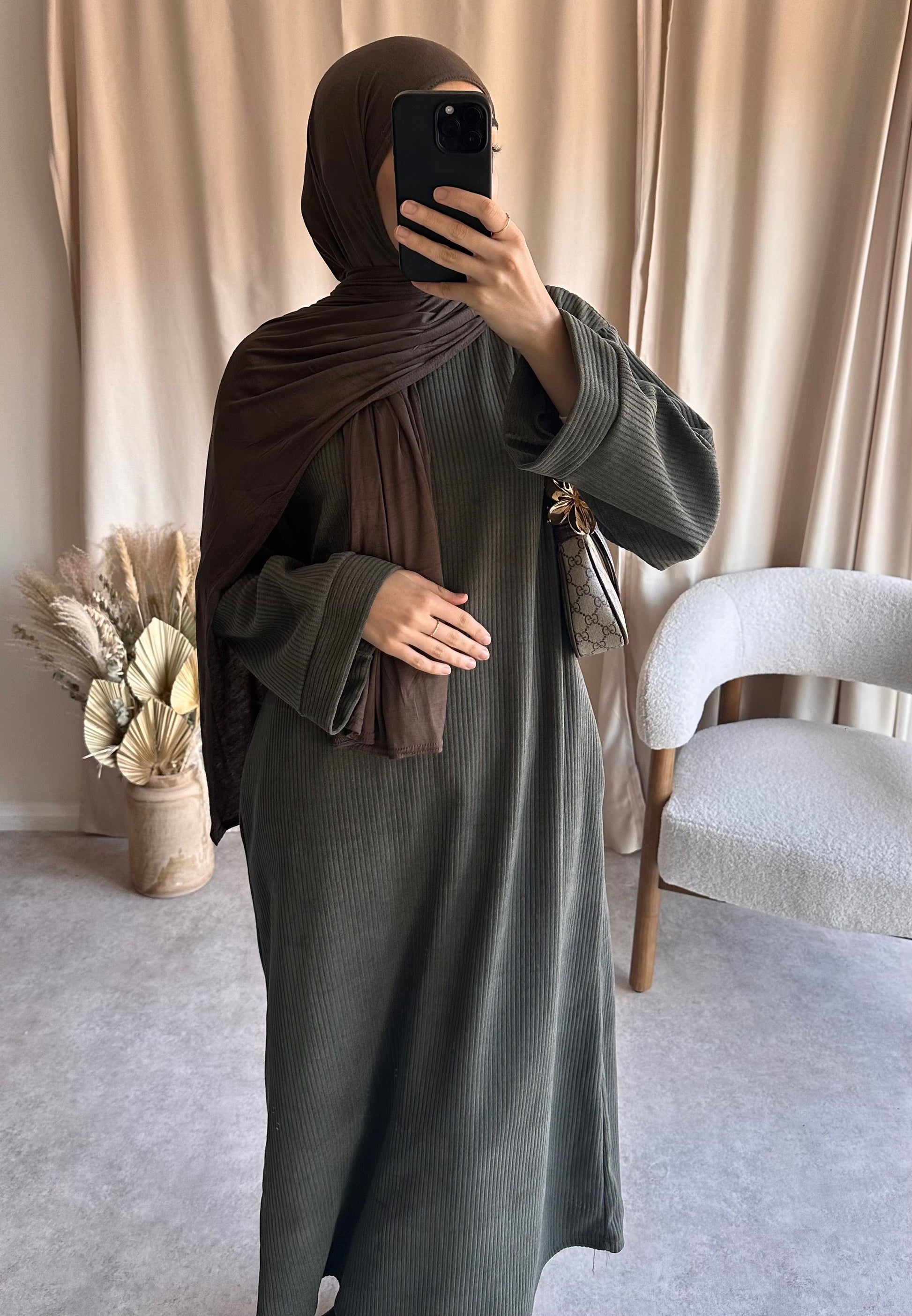 A cozy abaya dress made from a soft, corduroy inspired fabric. Designed with a relaxed fit and features two pockets. One-size only, measuring approx 52 inches in length. Ideal for height of 5'0 - 5'3 and UK size 4-8.