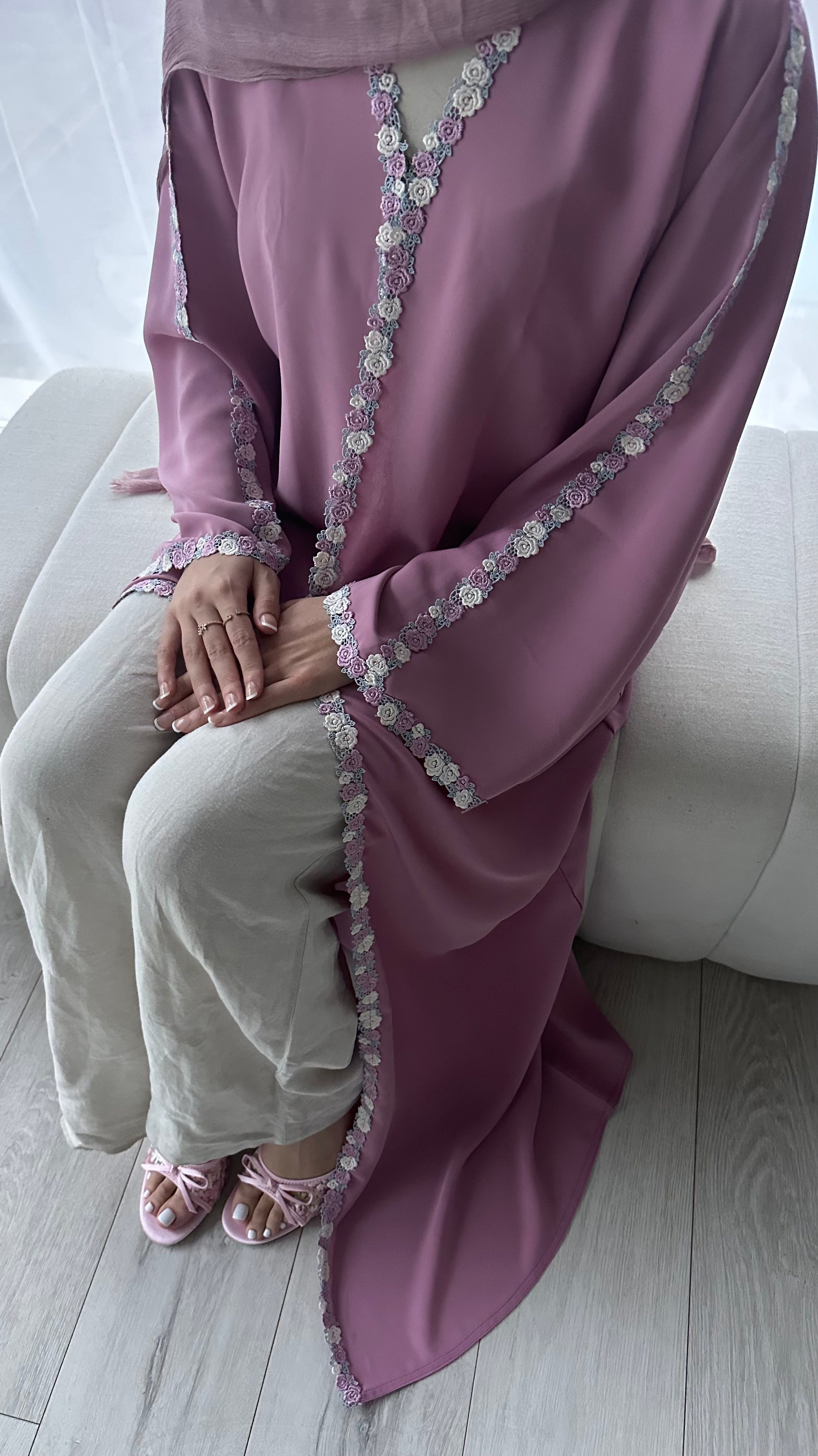 Gül collection, 3 beautiful lace prints paired with Korean Nidha fabric, these pieces are not one to miss! The perfect Eid/Summer kimonos, you can dress them up or keep it casual. Each piece comes with a matching chiffon hijab.
