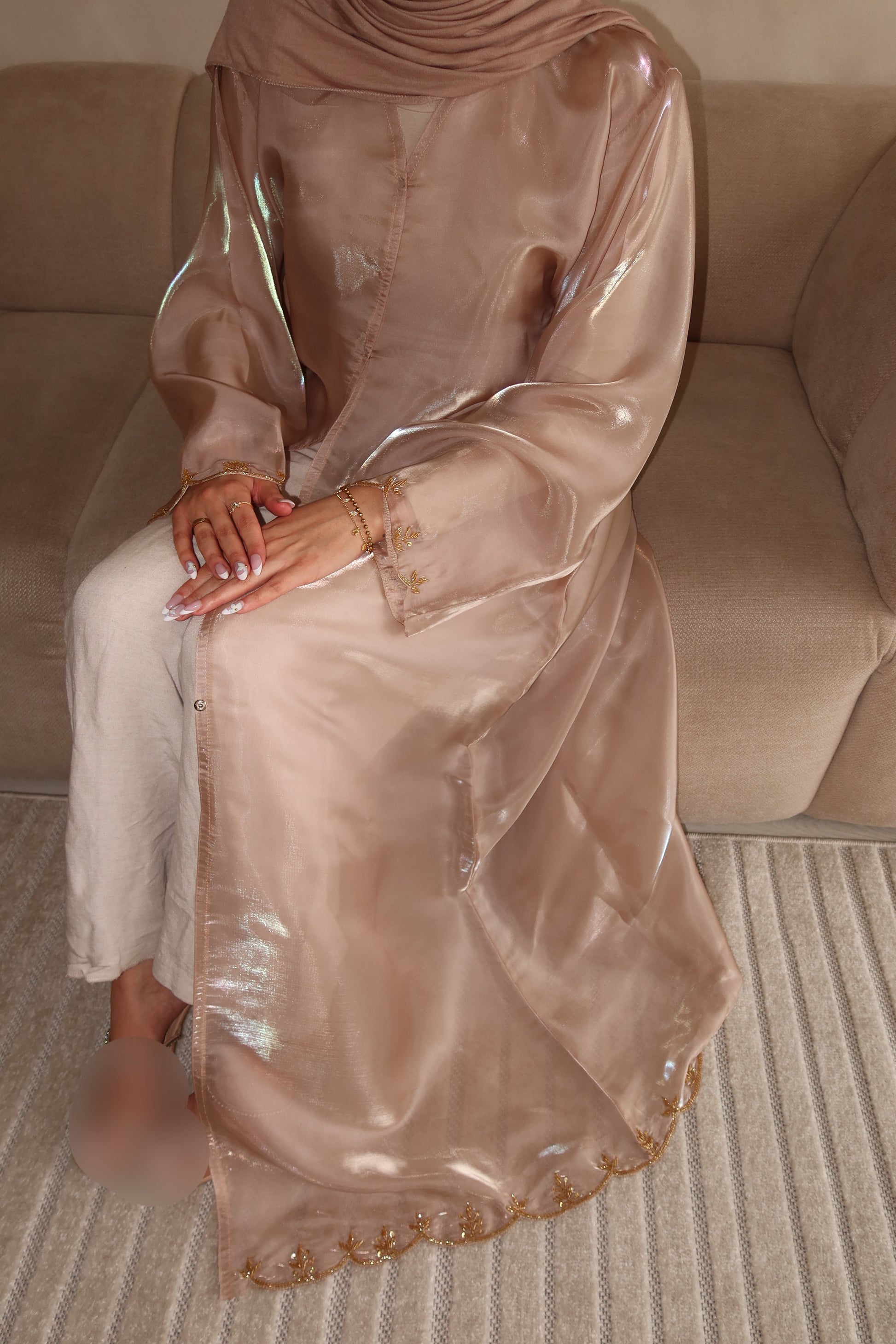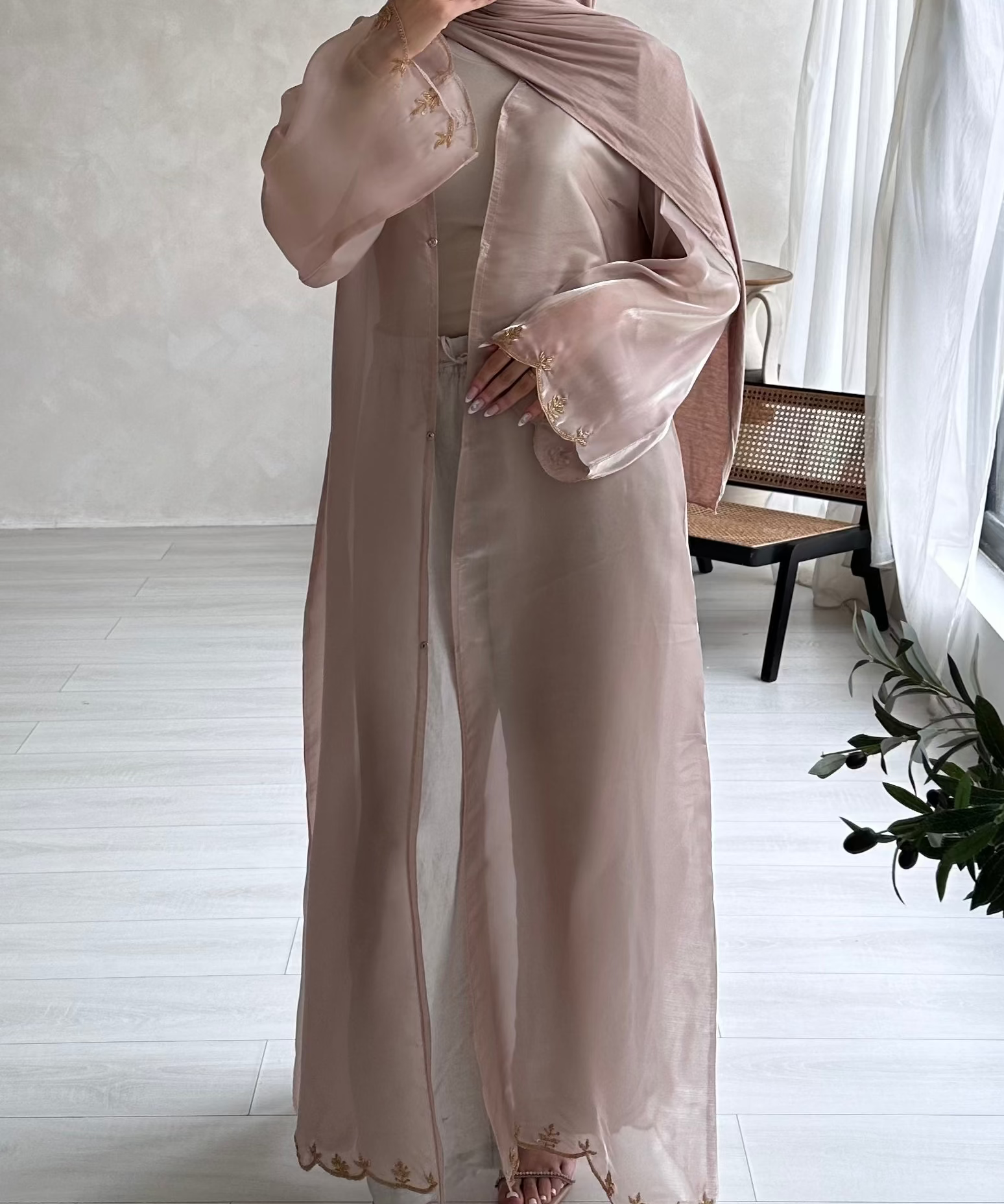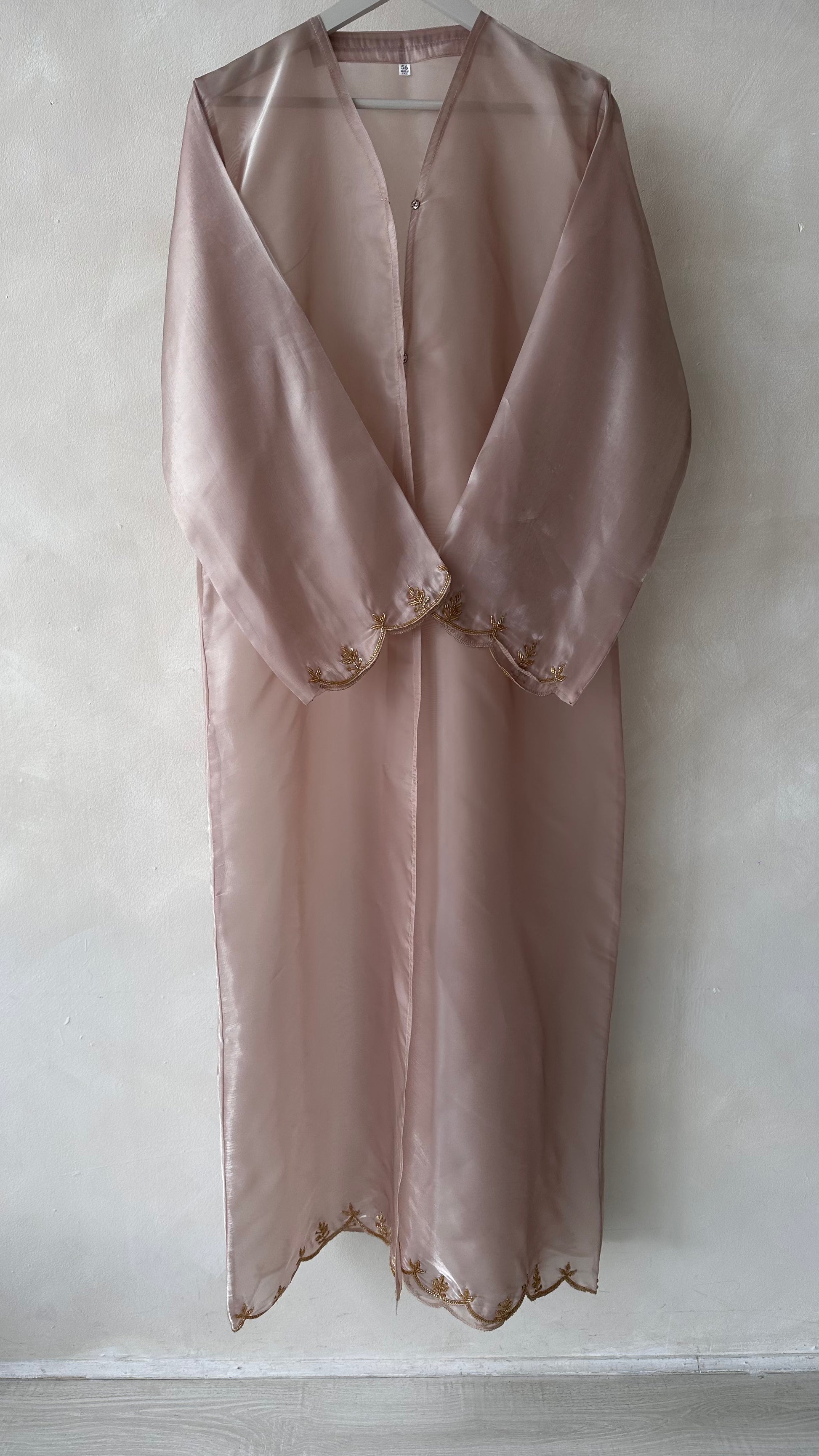 A stunning lightweight organza kimono featuring delicate gold scalloped embroidery along the sleeves and around the bottom. The perfect piece to elevate your outfits and give that luxury look.